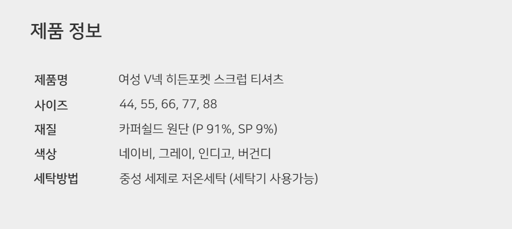 | 세탁방법 | 단독손세탁 / 세탁기가능 / 표백금지 / 천대고다림질 / 건조기사용금지 |