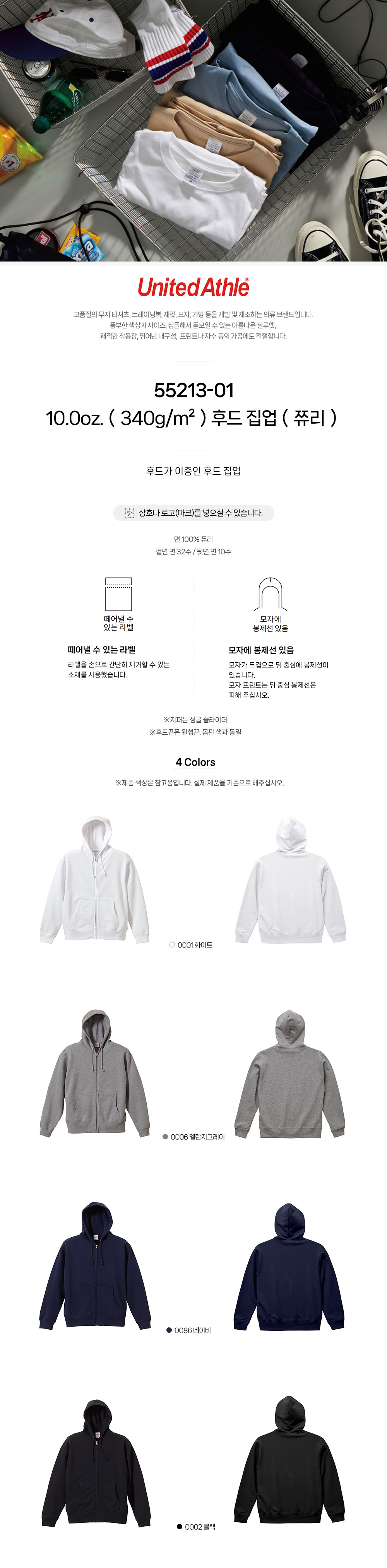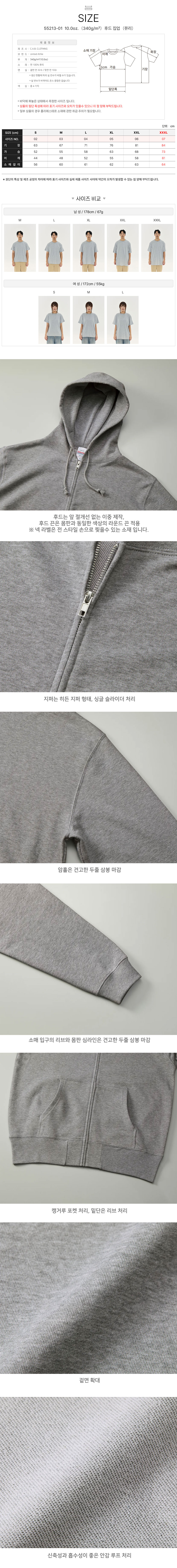 후드 집업(쮸리)55213-01 10.0oz.(340g/m²) 유나이티드 애슬 United Athle