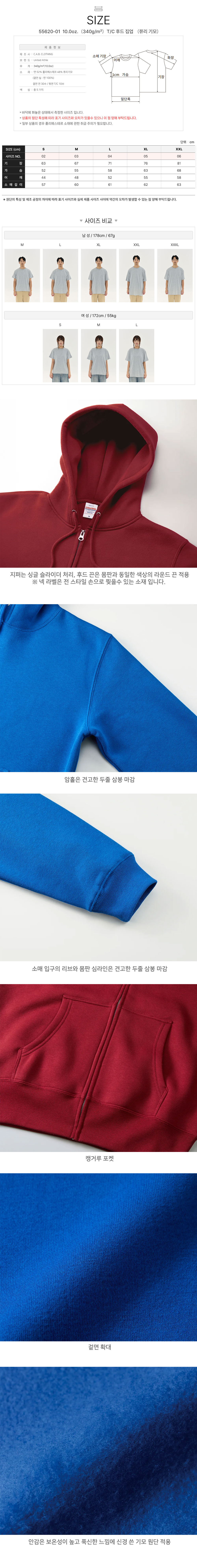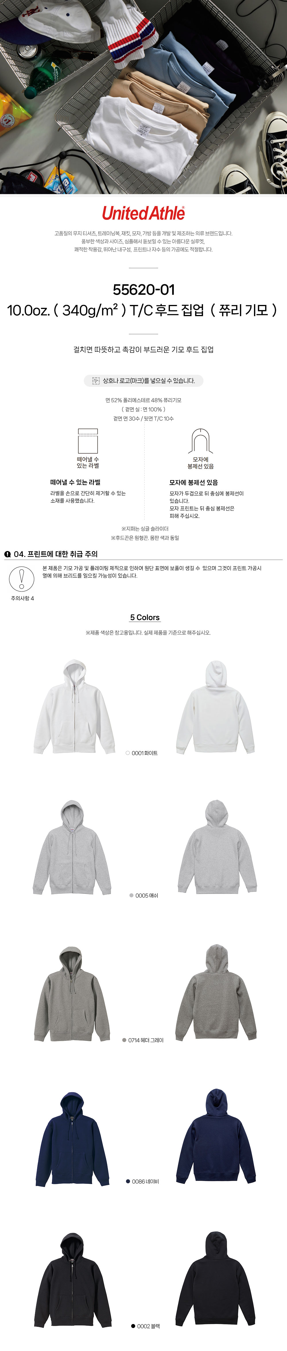 T/C 후드 집업 (쮸리 기모)55620-01 10.0oz.(340g/m²) 유나이티드 애슬 United Athle