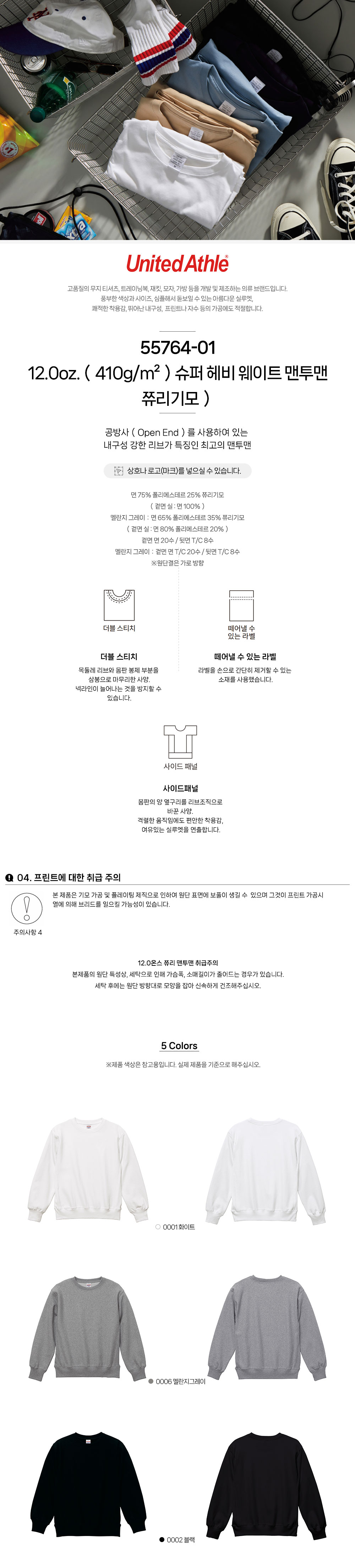 슈퍼 헤비 웨이트 맨투맨(쮸리기모)55764-01 12.0oz.(410g/m²) 유나이티드 애슬 United Athle